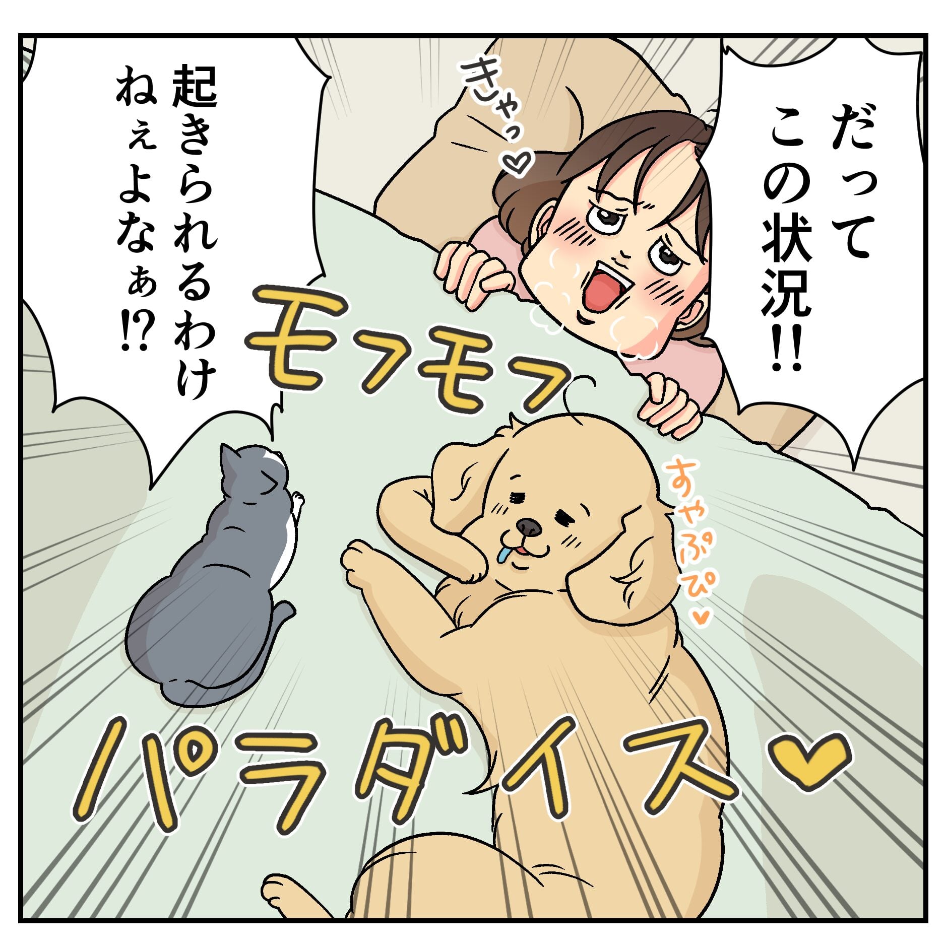 猫のまめちゃんと犬のアイビーが気持ちよさそうに寝ている姿を見てしまうと、起こすなんて無理だし、