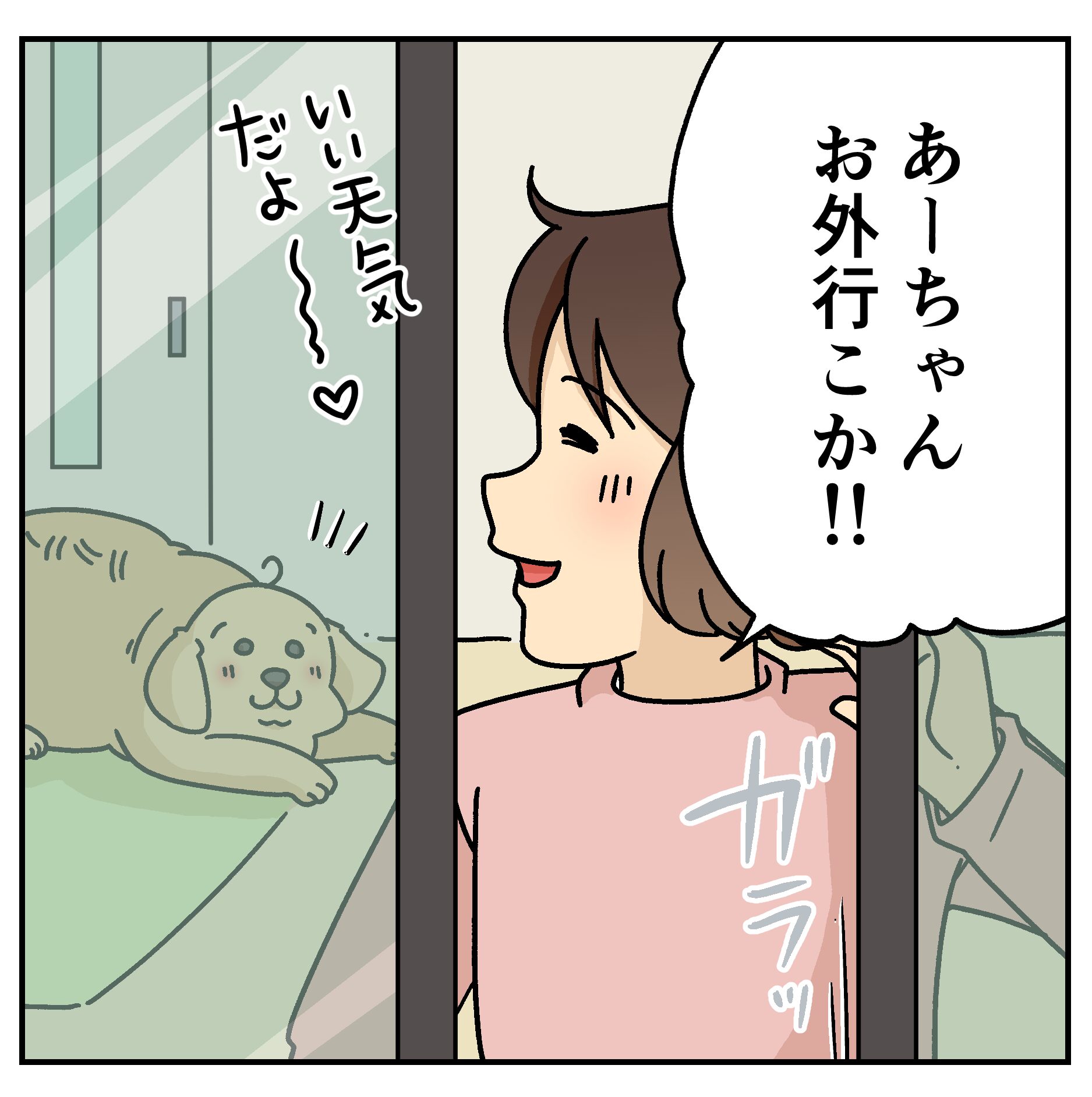 その日はとってもいいお天気で、作業が一段落したからあーちゃんとお外で遊ぼ♪と思って声かけたんだけど、なんだかあんまり乗り気じゃないあーちゃん。